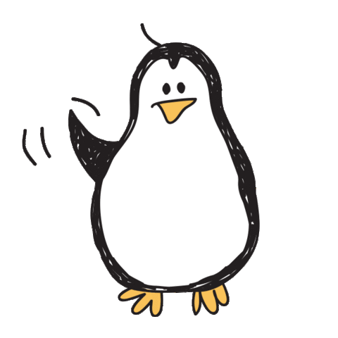 A cute, hand-drawn cartoon penguin with rosy cheeks waves happily, spreading good vibes and cheer.