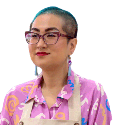 a woman with blue hair wearing glasses and earrings