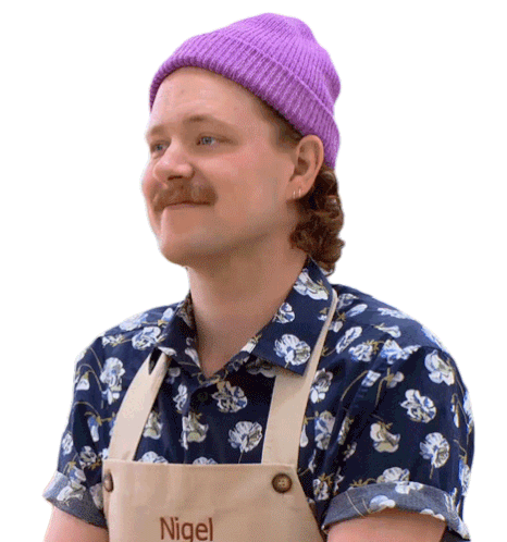 a man wearing a purple beanie and an apron with the name nigel on it
