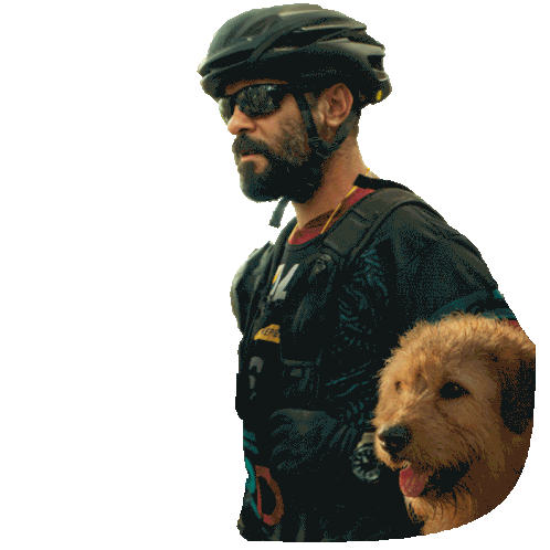 A man wearing a helmet and sunglasses holds a dog, with the motivational text "Anything Can Happen" behind them, featuring Arthur The King.