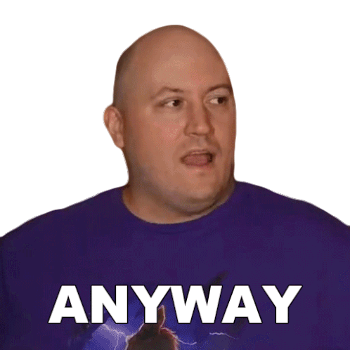 A bald man, identified as Aj, looks to the side with a slightly disgusted expression, wearing a purple shirt that says 'ANYWAY'.