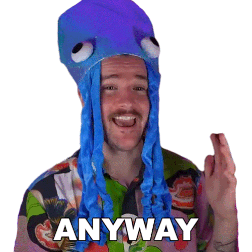 Jimmy, wearing a distinctive blue octopus hat and a colorful shirt, says 'Anyway' with a slight smile, perfect for transitioning topics.