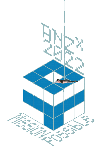 A person lies on a blue and white cube, with pixelated text 'ANZX 2022' and 'MESSAGE FOR THE FUTURE' appearing.