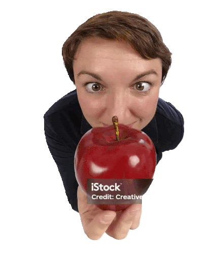 a woman is holding a red apple with a worm sticking out of it in front of her face