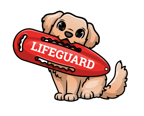a cartoon dog is holding a red lifeguard float in its mouth
