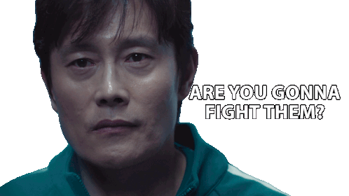 Hwang In Ho from Squid Game asks, 'Are you gonna fight them?' with a serious expression.
