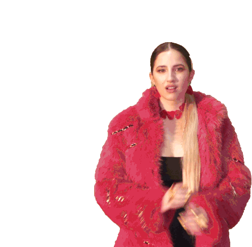 Aria Vega confidently posing in a vibrant red faux fur coat with arms crossed, looking stylish and thoughtful.