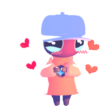 A cute Art Club character, Izzi, blushes shyly with hearts floating around, holding a small blue object, perfect for Discord.