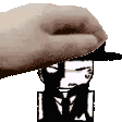 a hand is holding a hat over a man in a suit .