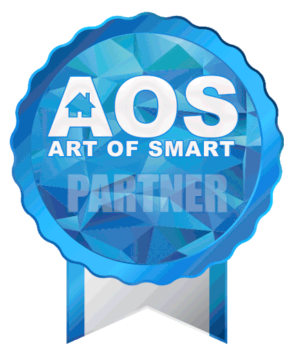 Animated logo for Art of Smart (AOS) and Art of Smart UK, featuring "Partner" text and a handshake icon.