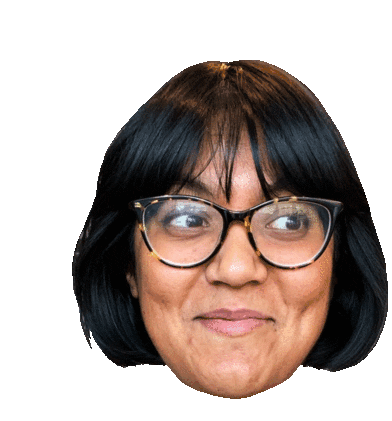 Arya Starkgeryan, wearing stylish eyeglasses, smiles playfully with a slight smirk while her head floats.