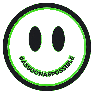 A vibrant 3D green and black smiley face sticker rotates, featuring the hashtag #ASSOONASPOSSIBLE on its smile.