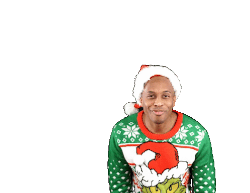 Askb Bernardson, wearing a festive Grinch Christmas sweater and Santa hat, joyfully dances with a big smile.