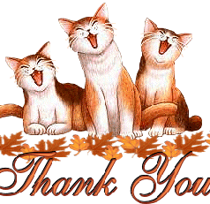 Three adorable cats with closed eyes and smiles, surrounded by autumn leaves, expressing gratitude with a 'Thank You' message.