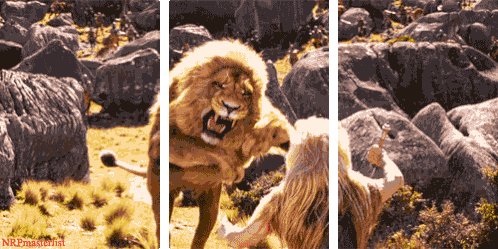 Aslan, the majestic lion, is seen in a fierce battle with a woman in a rocky, arid landscape.