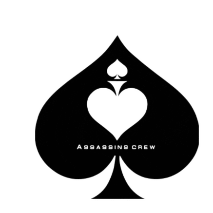 A striking black and white logo featuring an ace of spades with a heart and 'ASSASSINS CREW' text.