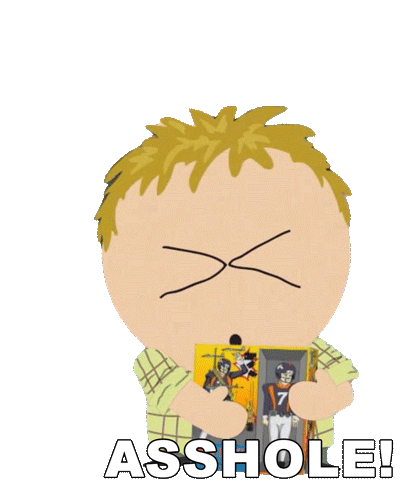 Thomas from South Park reacts with a pained, sad expression as the word 'ASSHOLE!' appears below him, while holding action figures.