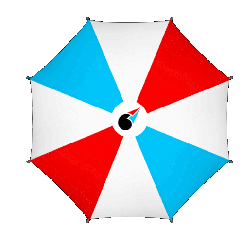 A colorful Astralon beach umbrella with red, blue, and white segments spins, featuring a compass-like needle in the center.