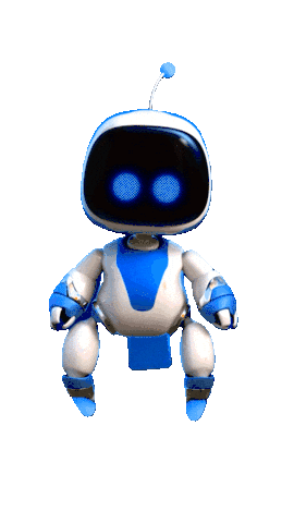 Astro Bot, the blue and white robot, floats and makes a "rock on" gesture with glowing blue eyes.