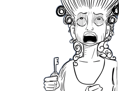 A character from Destripando La Historia, possibly Barba Azul, looks terrified while holding a key, expressing extreme fear. Pascu Y Rodri.