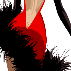 A stylish woman in a red backless dress with black gloves and a feathered boa sashays away with confidence.