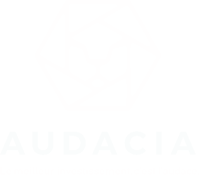 A clean, minimalist animated sticker featuring the Audacia logo, a stylized white hexagon with an aperture design and the company name.