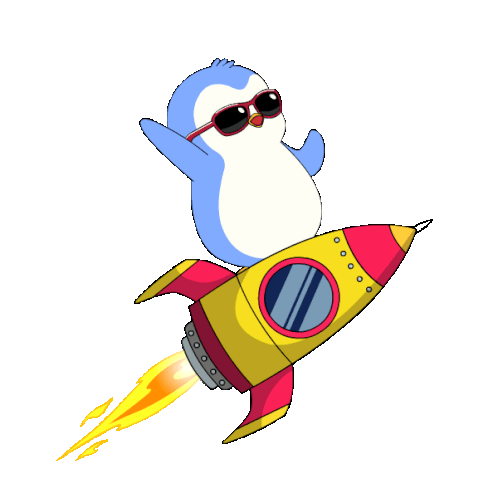 a penguin wearing sunglasses is sitting on top of a yellow and red rocket