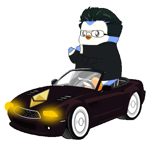 a penguin in a suit is driving a black car with a yellow envelope on the hood