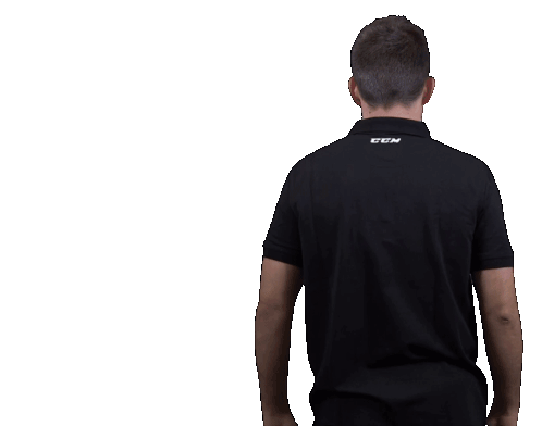 A man wearing a black polo shirt with "CCM" and "Av19 Hockey" logos turns from his back to face the camera and smiles.