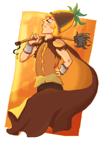 Immi Best, also known as Peter Pineapple, proudly poses in his pineapple hat and cape, holding a broom over his shoulder.