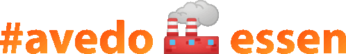 a logo for avedo essen shows a factory with smoke coming out of its chimneys