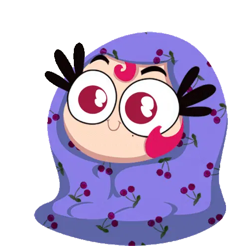 An adorable white character with horns sits inside an avocado half, next to another half filled with colorful cherries.