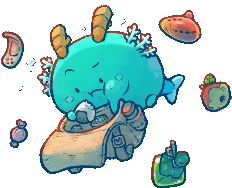 An adorable Axie Infinity creature, a blue blob-like character, happily eating a rice ball while sitting in its shell.