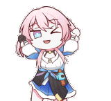 a cartoon girl with pink hair and a blue dress is holding a microphone in her hand .