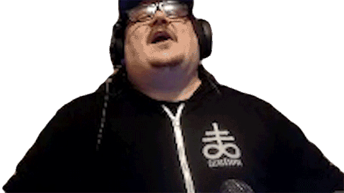 a fat man wearing headphones and a black shirt is standing in front of a microphone .