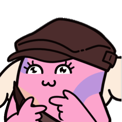 Azuki Meeko, the pink character, shyly points fingers together, wearing a brown cap and small wings.