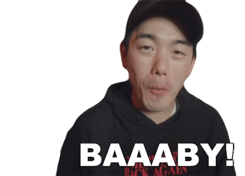 Eric Nam, wearing a black hoodie and cap, smiles broadly with 'BAAABY!' text, expressing excitement.