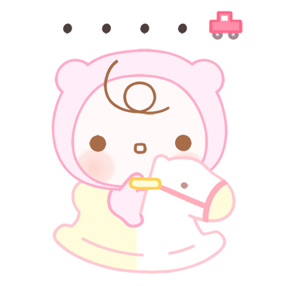 An adorable cartoon baby in a pink bear hood, happily riding a white rocking horse.