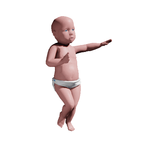 An adorable 3D animated baby in a diaper performs a lively dance, moving its arms and legs with joyful rhythm.
