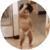 A joyful baby with an afro dances energetically in a diaper, celebrating with happy moves.