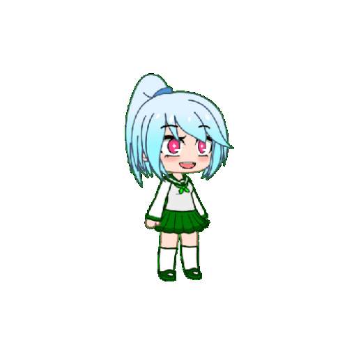A cute cartoon girl with blue hair and red eyes, wearing a green and white school uniform, smiles while mimicking.