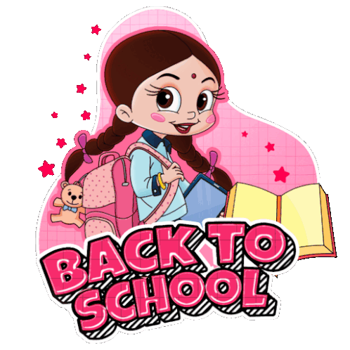 Chutki from Chhota Bheem is excited to go back to school, carrying her backpack and a tablet, with a book nearby.