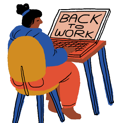 A sleepy person at a desk, initially dozing off, then waking up to type on a laptop displaying "BACK TO WORK". Perfect for post-holiday blues.