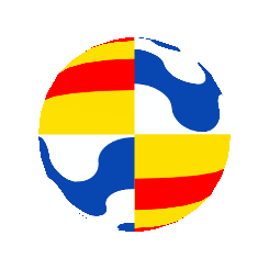 An animated circular ball featuring the colors and design of the Badalona flag, with blue and white waves over yellow and red stripes, flipping vertically.