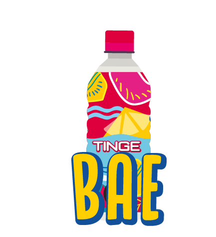 An animated sticker of a 'Tinge Bae' drink bottle, surrounded by floating hearts and hands making finger heart gestures.