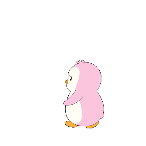 a pink penguin is carrying shopping bags and music notes are flying around it