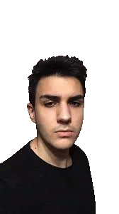 a young man in a black shirt is making a funny face on a white background .
