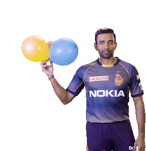 Robin Uthappa, wearing his KKR jersey, smiles playfully while posing with colorful balloons, then releases them.