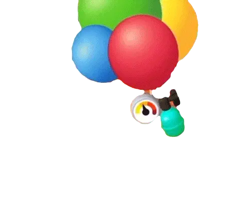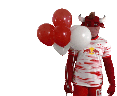 RB Leipzig mascot Bulli joyfully releases a bunch of red and white balloons, celebrating with an uplifted arm.