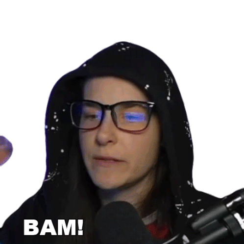 Cristine Raquel Rotenberg emphatically says 'Bam Bam Bam' with a hand gesture, wearing a hoodie and glasses.